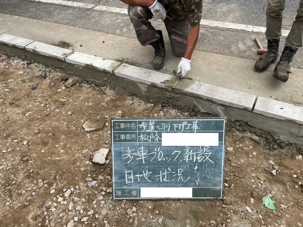 カッターを入れて 既存アスファルト及び歩車ブロック撤去
