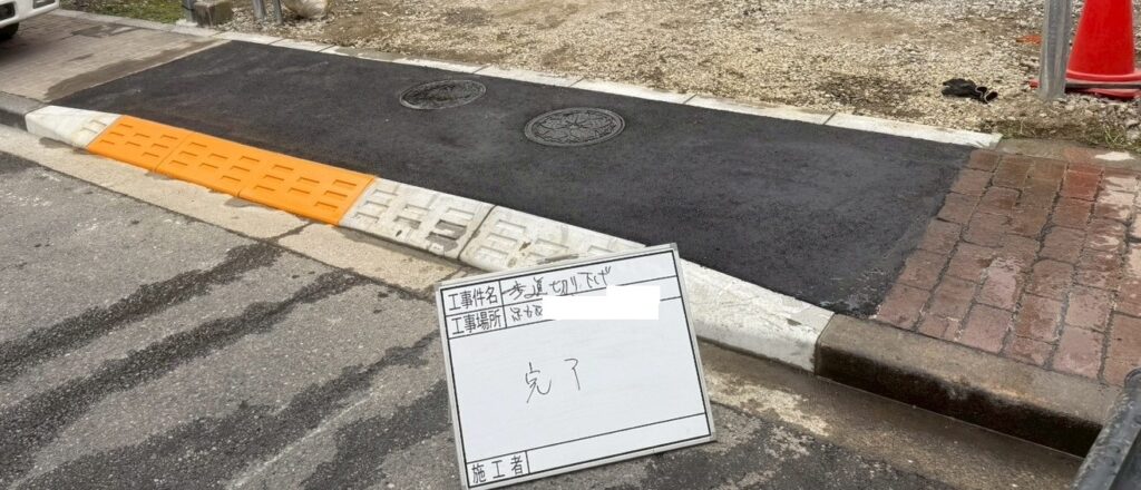 10月21日(月)足立区にて歩車ブロック切り下げ7個、地先境界石設置、アスファルト舗装工事にお伺い致しました。